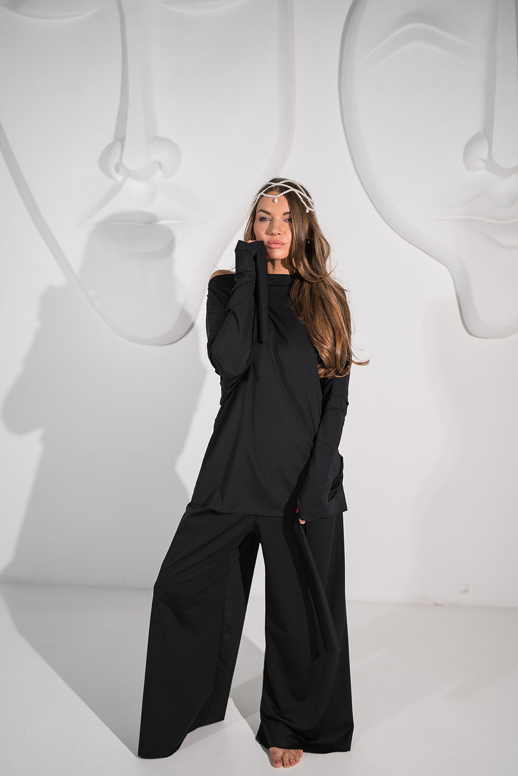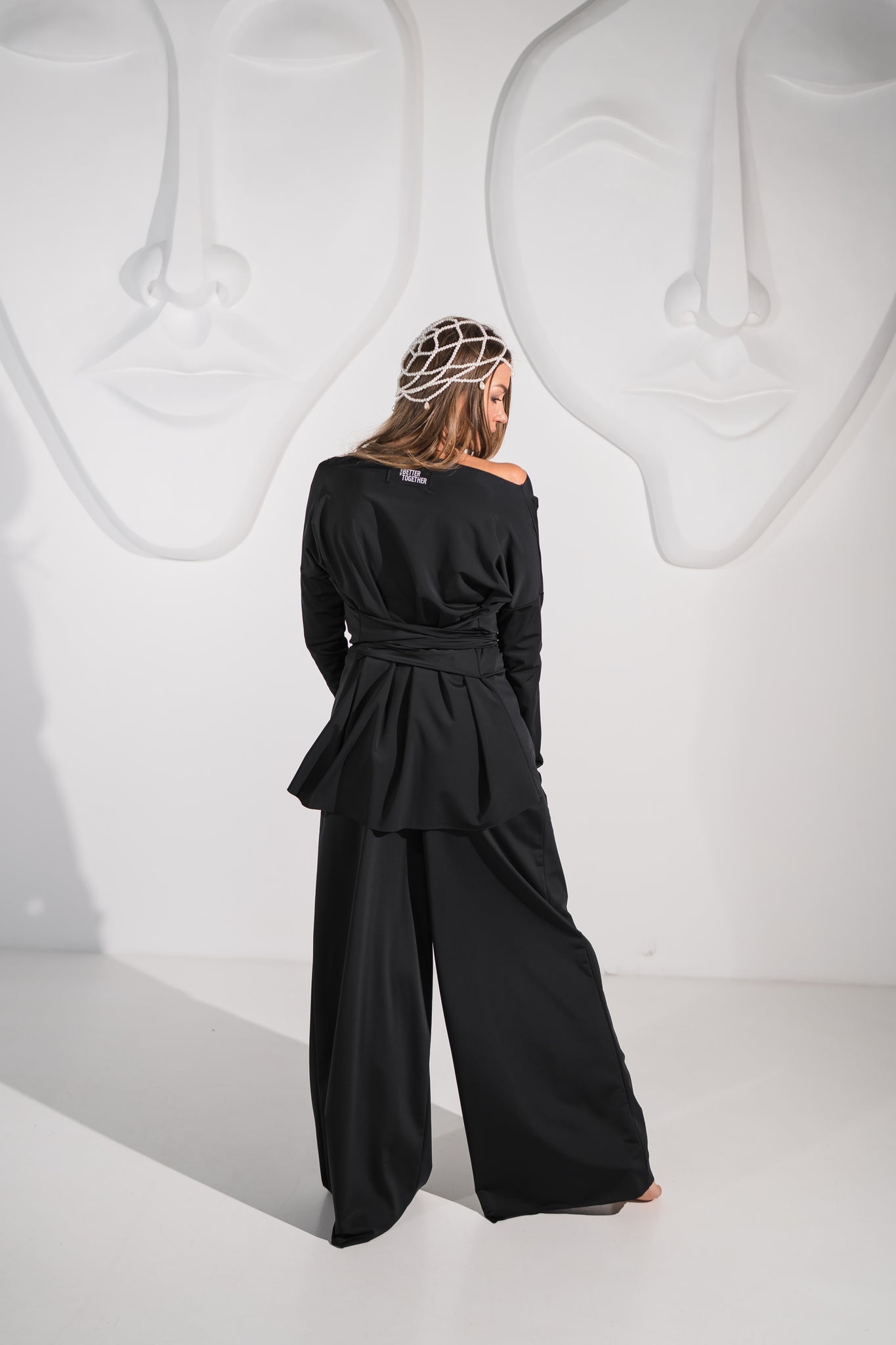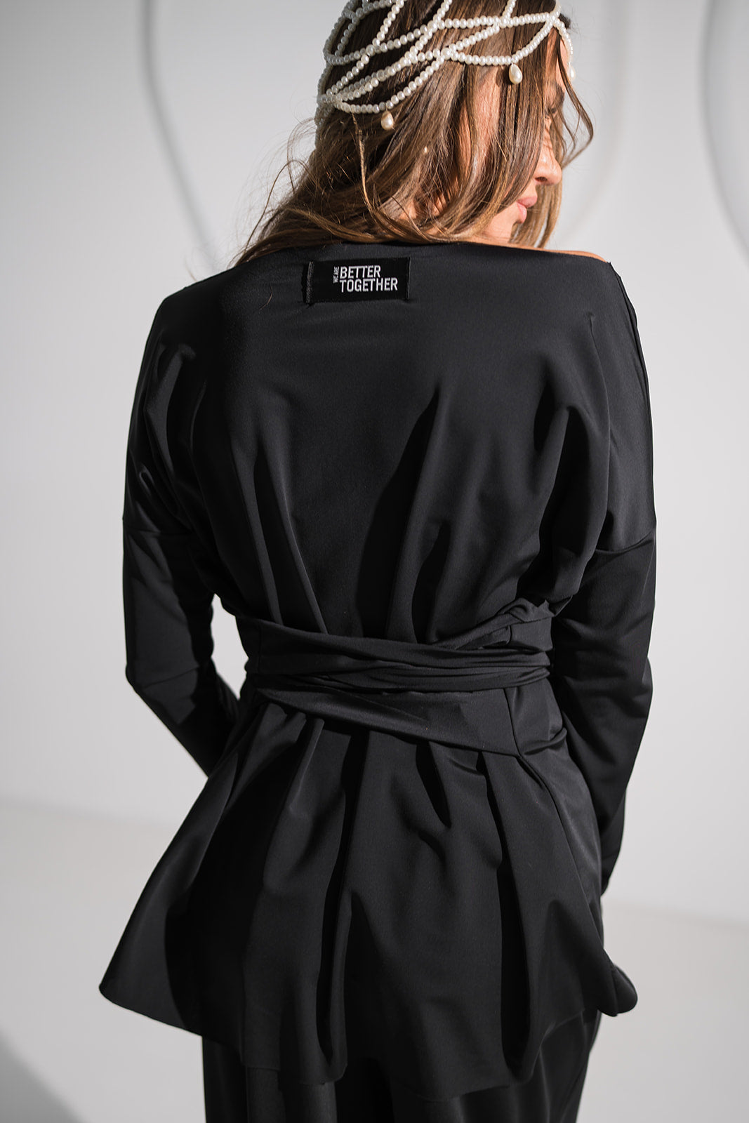 Sasienam blūze ar garām piedurknēm un laiviņas kaklu. Blūzi iespējams sasiet gan priekšpusē, gan aizmugurē. Piegriezums ir oversize, lai brīvi un ērti piekļautos ķermenim.
