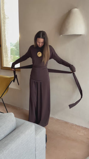 Sasienam blūze ar garām piedurknēm un laiviņas kaklu. Blūzi iespējams sasiet gan priekšpusē, gan aizmugurē. Piegriezums ir oversize, lai brīvi un ērti piekļautos ķermenim.